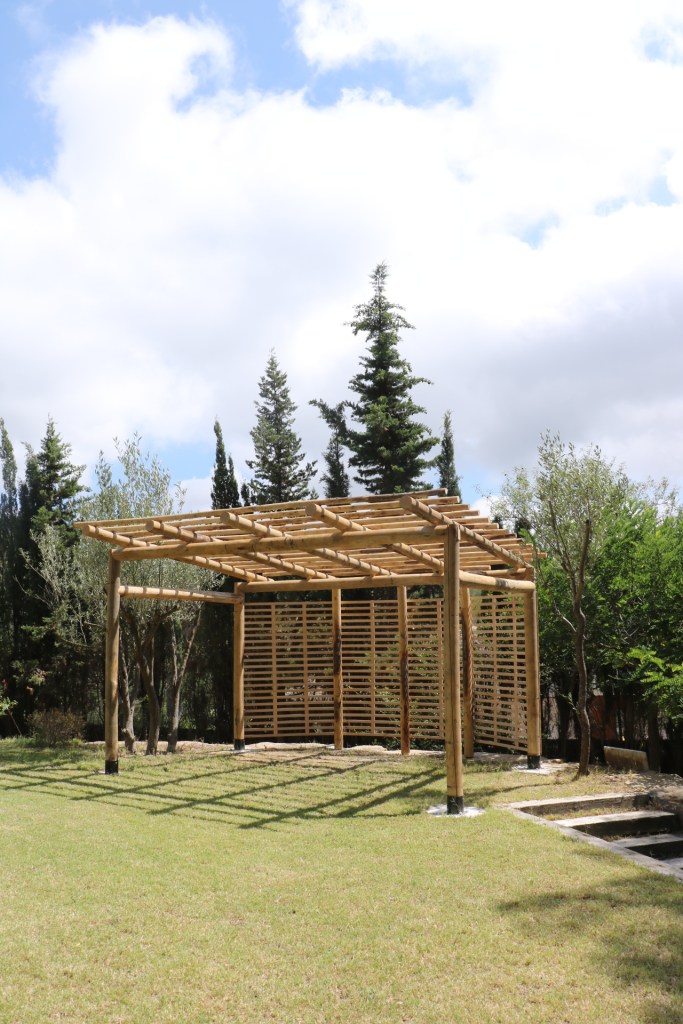 Mediante encajes de media madera y de caja y espiga hice la estructura principal, luego para unir perpendicularmente las secciones redondas en un único punto mecanicé unos discos/separadores con doble curvatura adaptada a los distintos diámetros del proyecto, estos discos inmovilizan las barras usando un solo tornillo por unión y sin necesidad de hacer encajes.