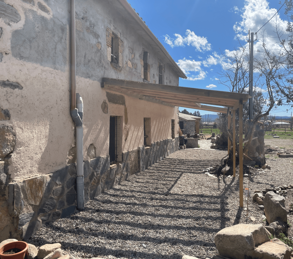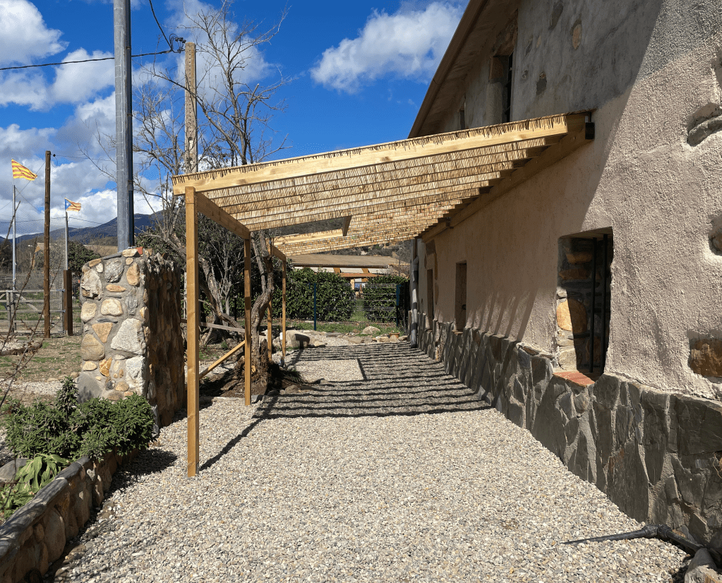 En este proyecto, la necesidad de un espacio de cobijo exterior era clave, no solo para la relación de los niños con el exterior, sino como un escudo de protección del sol y el calor en verano para las salas interiores de la masia.