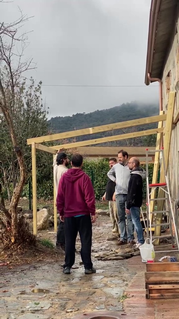 Esta cubierta exterior se adosa por un lado a la pared existente, y por otro lado se apoya en dos porticos apoyados en el suelo, todo el material se preparó en taller para facilitar el montaje, hecho conjuntamente con los padres del centro educativo.