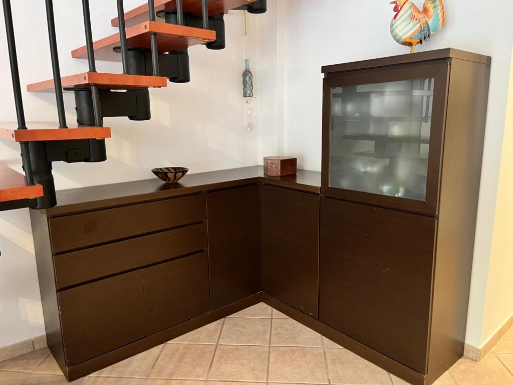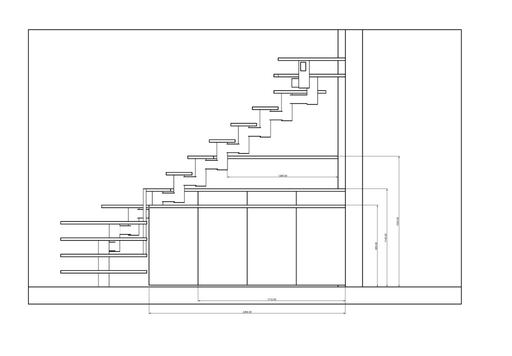 El objetivo en este encargo era integrar un espacio de almacenaje debajo de una escalera de peldaños sin fondo. Aprovechando la modulación de los peldaños, cree un volumen bajo de mayor capacidad, un cuerpo intermedio de cajones y una repisa que remata el mueble.