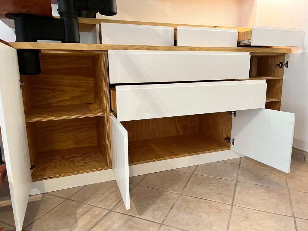 El material de las encimeras y repisa es pino flandes, mientras que los muebles y cajones están hechos de contrachapado de pino.